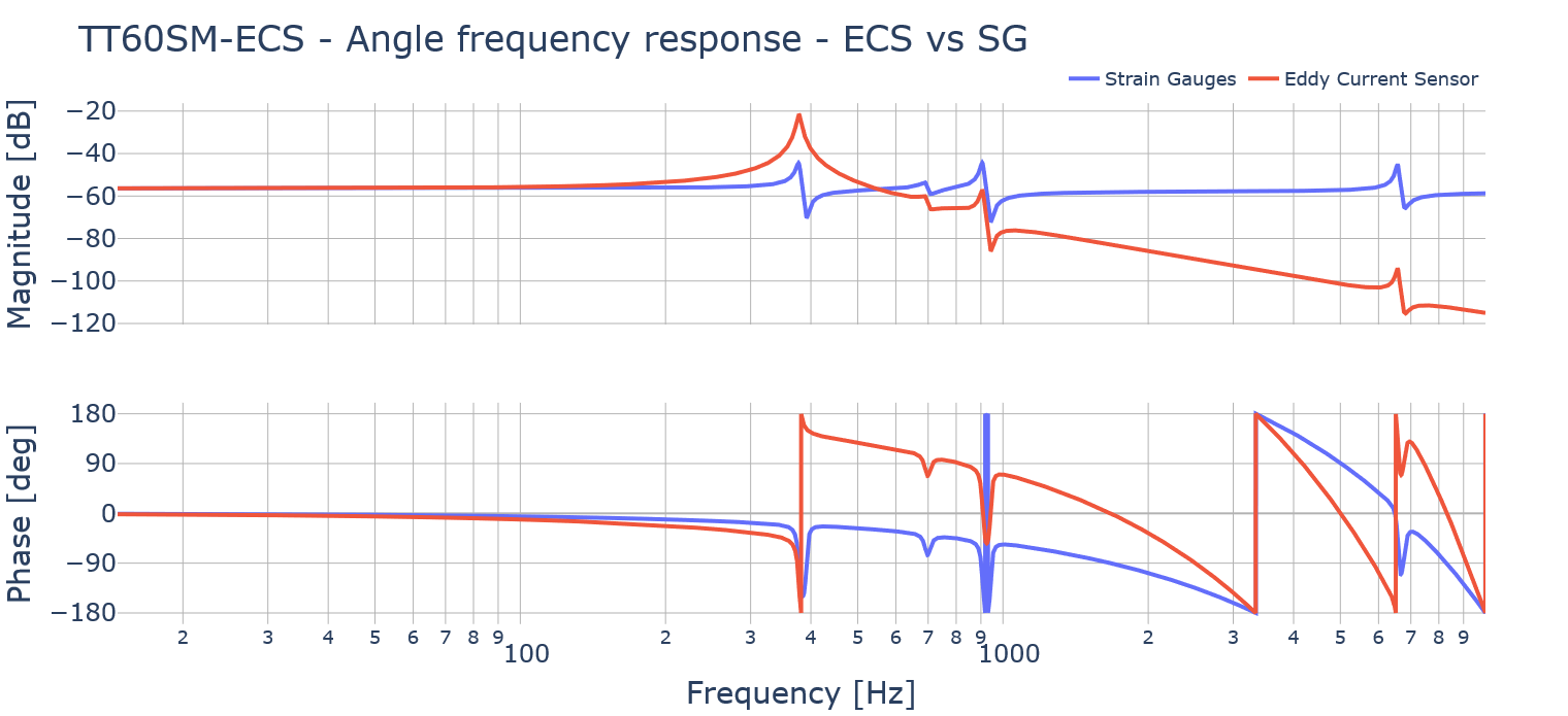 On Figure 1, the ECS response above the first resonance frequency is more detailed and accurate than with SG sensors. This enables the implementation of advanced control techniques as previously described. Our solution integrates an electronic front end close to planar coil probes (we offer both single and differential configurations). This compact solution—probes plus narrow electronics—minimizes an inherent issue with eddy current sensors, namely the parasitic effects of the cable, which reduce overall accuracy. Additionally, the signal conditioning is immune to electromagnetic compatibility (EMC) issues .