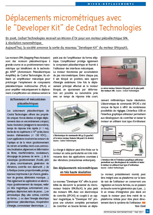 La Revue Micronora Informations nous fait l’honneur de publier un article sur le Nouveau « developer kit » du moteur piezo SPA30uXS.