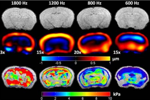 Magnetic resonance elastography (MRE) is a non-invasive imaging technique for quantitative measurement of the mechanical properties of biologic tissue in vivo [1]. The clinical interest in MRE has largely been driven by the direct relationship between tissue health and stiffness. As a result, MRE may provide significant clinical value for the non-invasive diagnosis of pathology and response to therapy by tracking tumor development and monitoring therapeutic response. MRE may also have considerable value in the development of treatment protocols in pre-clinical, rodent models of cancer. Because of cost and versatility, the mouse, in particular, is widely employed in oncologic studies. To resolve its small anatomic features, MRE experiments in mice must be performed with high driving frequencies (>600 Hz). However, high-frequency waves exhibit increased attenuation, reducing wave penetration depth and making it more difficult to impart motion deep into tissue with sufficient amplitude to overcome background noise. Also, biologic tissue is viscoelastic; hence, its response to load depends on the driving frequency. Recent MRE studies in mouse brain have been performed in high-field scanners (7 – 11.7T) at single driving frequencies of 1000 and 1200 Hz [2,3]. Here, we perform elastography in mouse brain tissue at 4.7T and report viscoelastic material properties over a range of driving frequencies (600 – 1800 Hz).