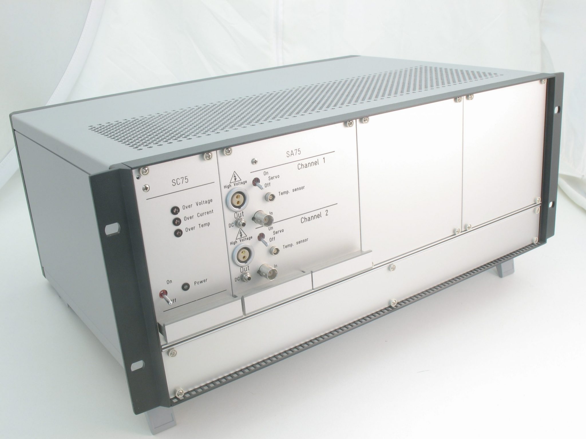 Nowadays, piezoelectric actuators (PA) are used in fast power actuations and high power applications as requested in machine tools or helicopters flap applications. Regarding to the low power capability and high loss ratios of linear amplifiers, Switching Power Amplifiers (SA75X) is designed by Cedrat Technologies to drive piezoelectric actuators in such applications. The switching technique (up to 100 kHz) allows high current peaks required by impulse or by high frequency applications on large piezoelectric actuators (or actuators in parallel) and allows energy harvesting.
